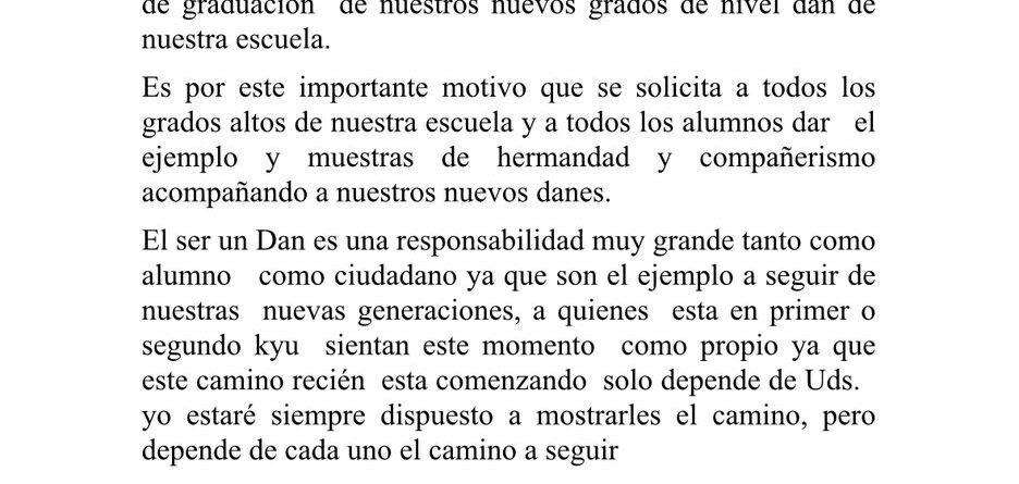 El ser un Dan es una responsabilidad muy grande tanto como alumno   como ciudadano ya que son el ejemplo a seguir de nuestras  nuevas generaciones, a quienes  esta en primer o segundo kyu  sientan este momento  como propio ya que este camino recién  esta comenzando  solo depende de Uds.   yo estaré siempre dispuesto a mostrarles el camino, pero depende de cada uno el camino a seguir