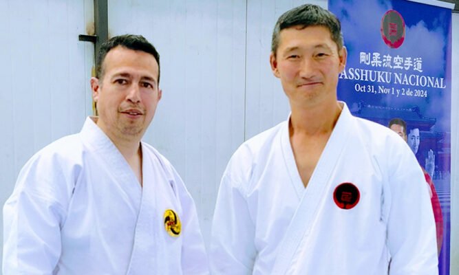 El director de la escuela Seibukan Goju Ryu y también discípulo de Hanshi Uchima fue parte de la cita que abordó “todo tipos de técnicas para la defensa personal y de karate tradicional, como kakie, junbi undo, hojo undo y katas tradicionales de Okinawa”, resaltó el mismo Sierpe, quien fue invitado por el sensei Manuel Easton, líder de Nintai Dojo y organizador del evento. En la foto, el maestro puntarenense (izquierda) junto al sensei Tetsuji Nakamura, líder mundial IOKF.